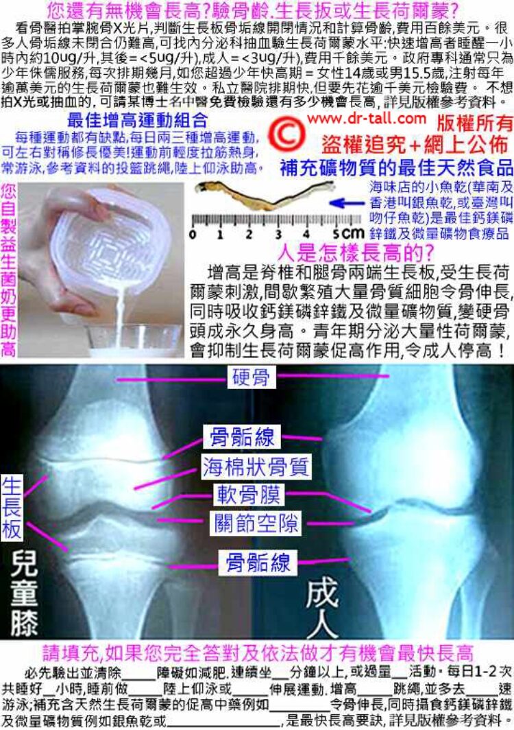 很多人常跳繩.打籃球或摸高仍難長高甚至縮矮變橫,或身體活動時,骨頭會發出咯咯聲!(除特別聲明外,本網站全部資料皆原著創作,版權屬於非凡集團李迪成教授所有,任何侵權行為必被追究兼網上公告)李迪成教授比對大量來診個案及體檢結果,發現高跳運動只能令32%易長高的青少年更高,對38%無效也無礙;但30%人因生長荷爾蒙不足令骨伸長,或缺礦物質逾10%,骨不夠硬(尤其是起床3小時內),或有扁平足等難長高者,若經常快跑高跳,或多做重力運動,會停高甚至縮矮橫生,或把原本已不夠厚的骨頭兩端白色軟骨磨得更薄,身體活動時,骨頭互踫會發出咯咯聲!如果您不信,可以把嫩鶏腿的長骨兩端,以輕中力度撞地幾十下,然後量度是否被撞短了!